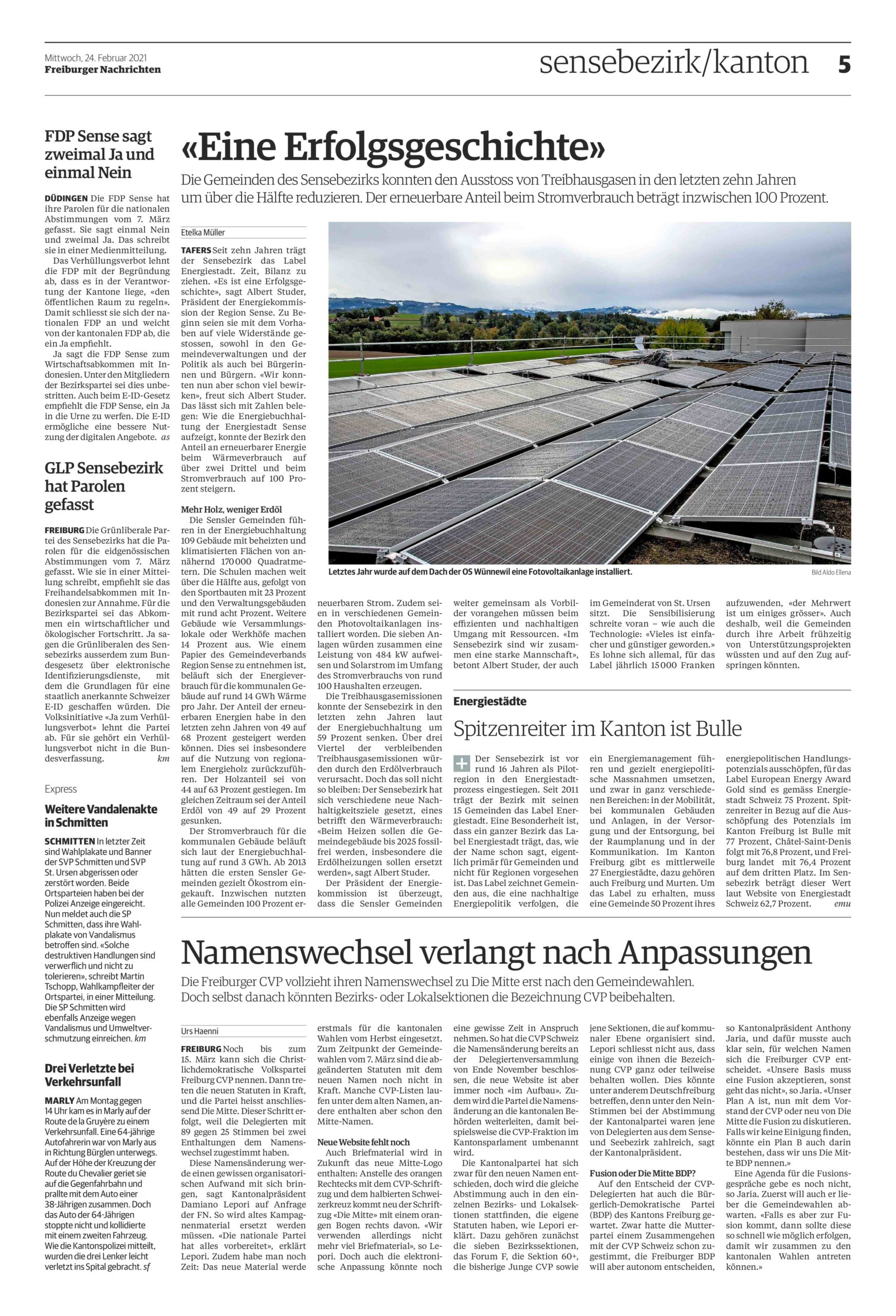 Die Gemeinden des Sensebezirks arbeiten seit zehn Jahren mit dem Energiebuchhaltungsprogramm EnerCoach, um die Verbräuche und Effizienz ihrer Gebäude und Anlagen zu messen. In einem Zeitungsartikel der Freiburger Nachrichten blickt der Präsident der regionalen Energiekommission (zurück) auf die Energiebuchhaltung und die Entwicklung der kommunalen Energieverbräuche. NET begleitet im Rahmen eines Beratungsmandats die Gemeinden des Sensebezirks u.a. bei der Energiebuchhaltung.